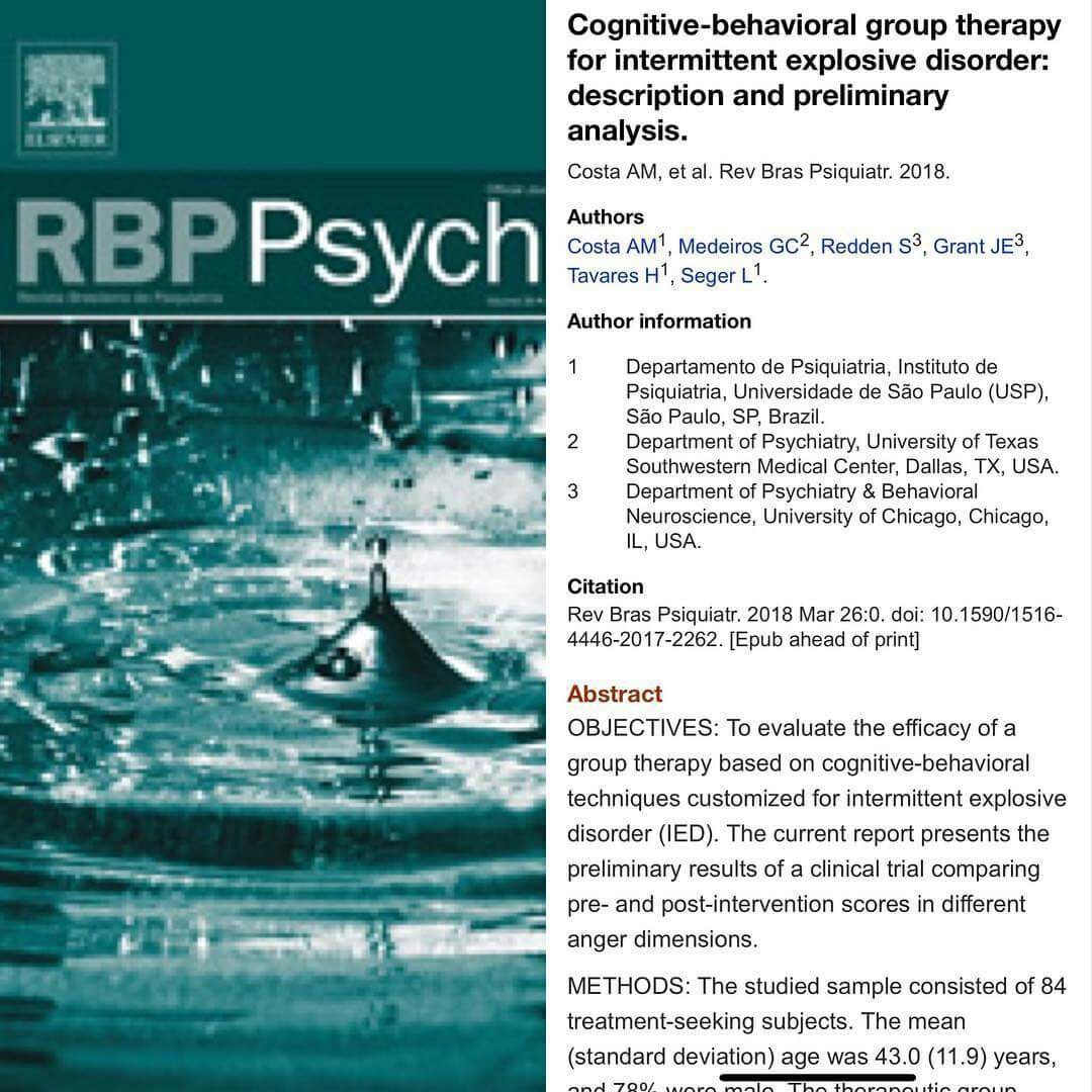 Compartilho com satisfação e orgulho a publicação na Revista Brasileira de Psiquiatria do trabalho de pesquisa referente aos excelentes resultados obtidos com o tratamento psicoterápico para portadores do Transtorno Explosivo Intermitente.